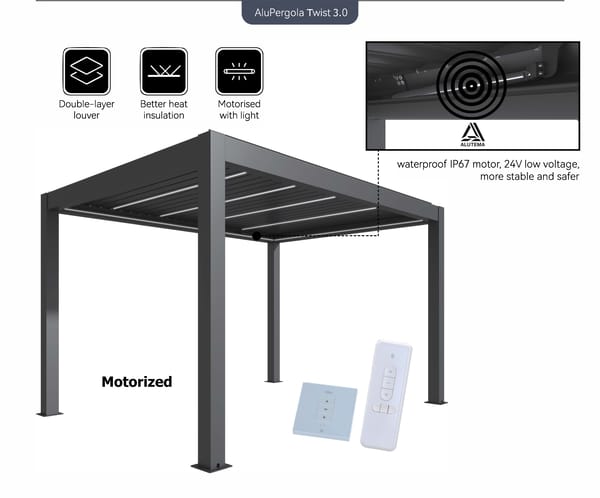 Upgrade your outdoor space with the AluPergola Twist 3.0, engineered for maximum durability and style. Featuring double-layer louvers with built-in LED lighting and waterproof rubber seals, this pergola offers premium weather protection and modern ambiance.