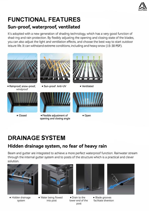 Advanced Shading and Waterproofing: Features a new generation of shading technology with adjustable top louvers for sun and shade control. An integrated beam and gutter system, along with advanced rubber sealing and double-layer waterproof blades, provide excellent rain protection and heat insulation.