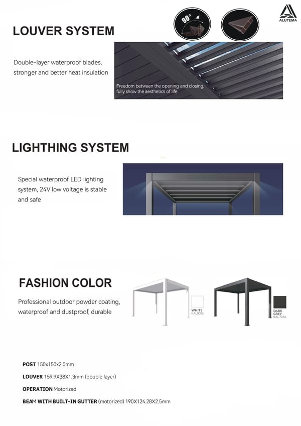 AluPergola Twist 3.0 is the latest high-end generation of aluminum pergolas, featured with strongerstructure design to withstand strong wind and heavy snow in harsh outdoor environments, con-structed from high-quality aluminum. lt quarantees the durability and solidity of the entire structurewhile offering a variety of functional options, including louver LED lighting, perimeter LED lighting.and RGB LED lighting. The LED lighting come with dimming functionality. The pergola supportsboth freestanding and wall-mounted installation methods. lt is a 100% waterproof, semi-perma-nent outdoor roof pergola with water and electricity separated post. The adjustable top louversallow you to easily choose between sun and shade.