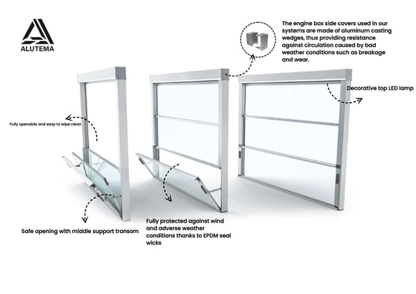The system allows for staggered opening of the glass panels, enabling practical and easy temperature control inside the space without opening all windows.